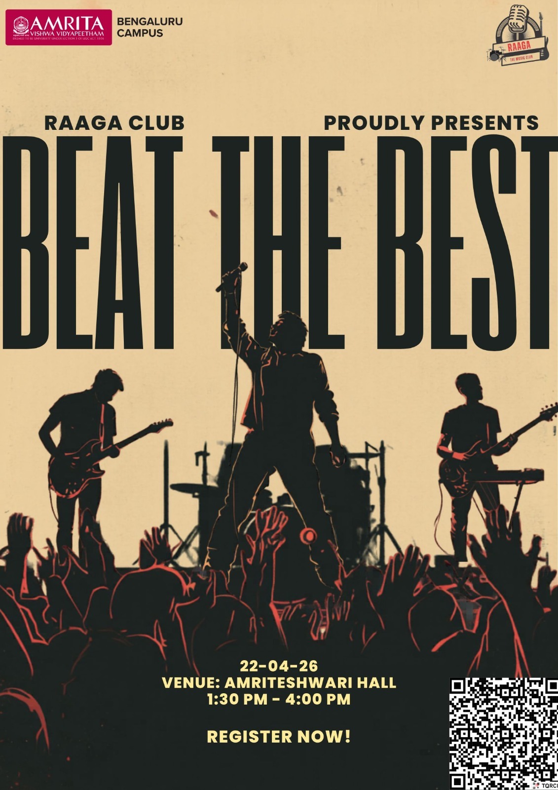 BEAT THE BEST – The Ultimate Musical Face-Off 🔥🎶 Presented by RAAGA – The Music Club, "Beat the Best" is a fierce, high-stakes musical competition designed for those who want to outshine and outperform the rest. This isn't just a standard talent show; it's an intense, head-to-head battle where musicians push their limits with zero second chances. Event Highlights: Who can join: Vocalists, guitarists, drummers, and all musicians ready to bring raw talent to the stage. 🎤🎸🥁 Genres accepted: Rock, fusion, classical, indie, experimental—bring your unique sound. The Format: Intense head-to-head showdowns where every round raises the bar. ⚡ Bring your energy, claim the stage, and prove you have exactly what it takes to Beat the Best! 🏆💥